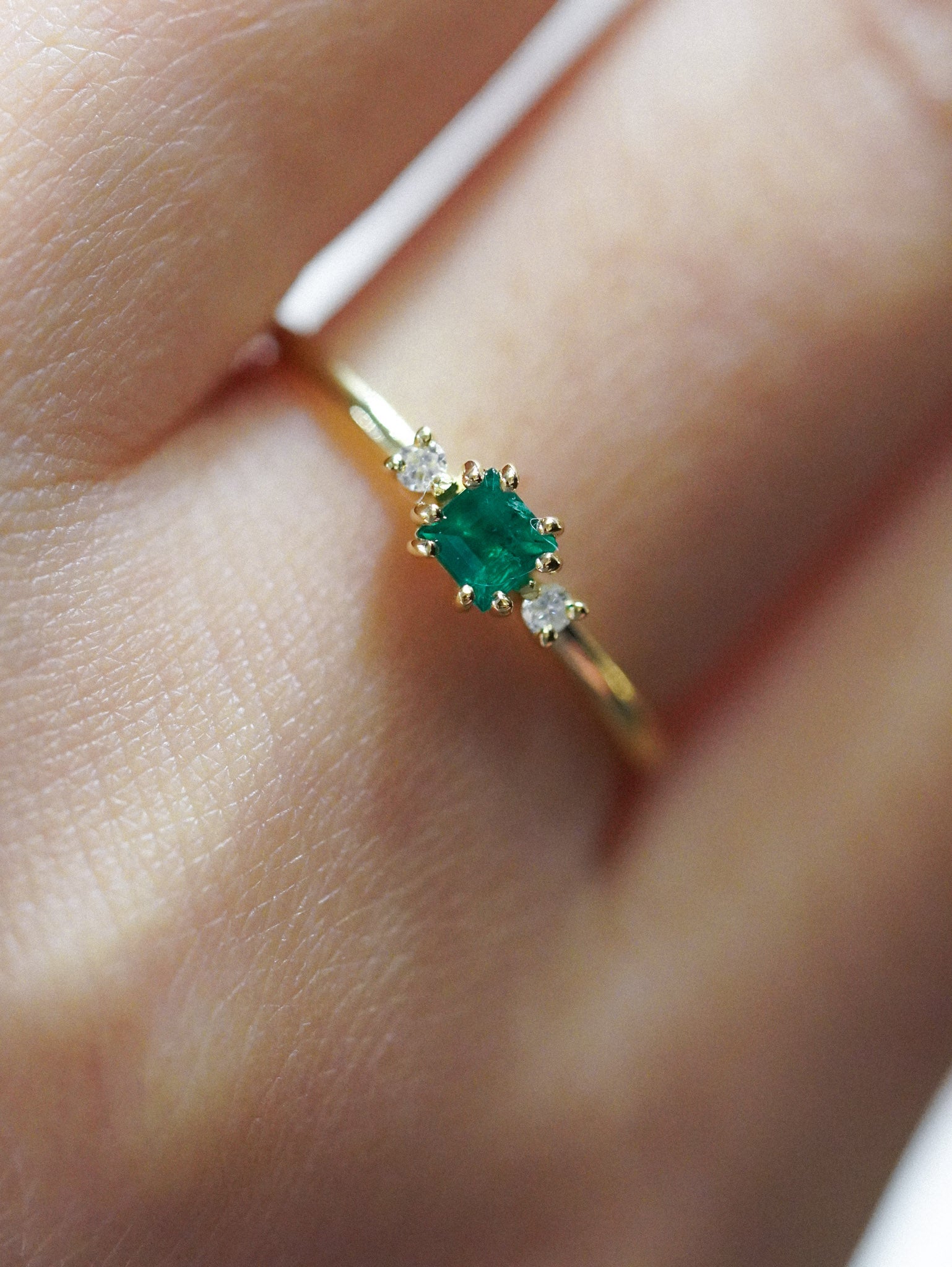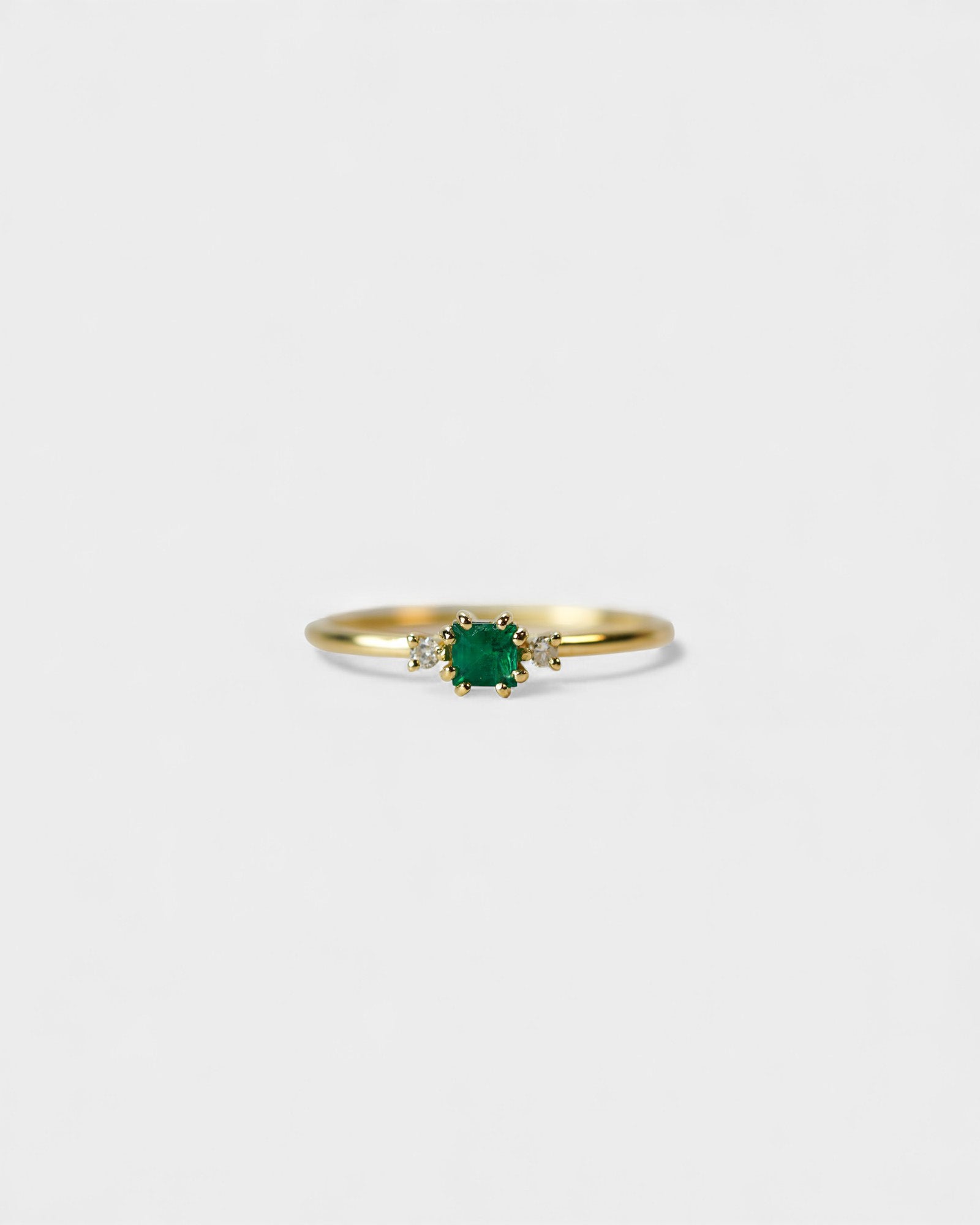 Anello in oro giallo con smeraldo carrè e due diamanti bianchi