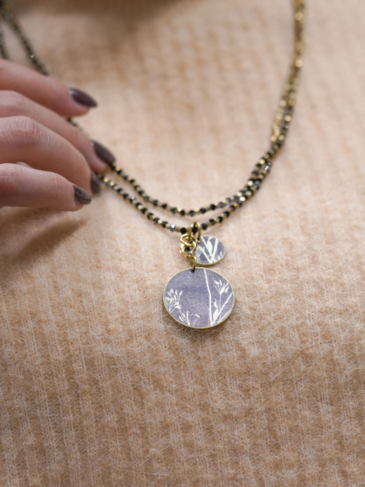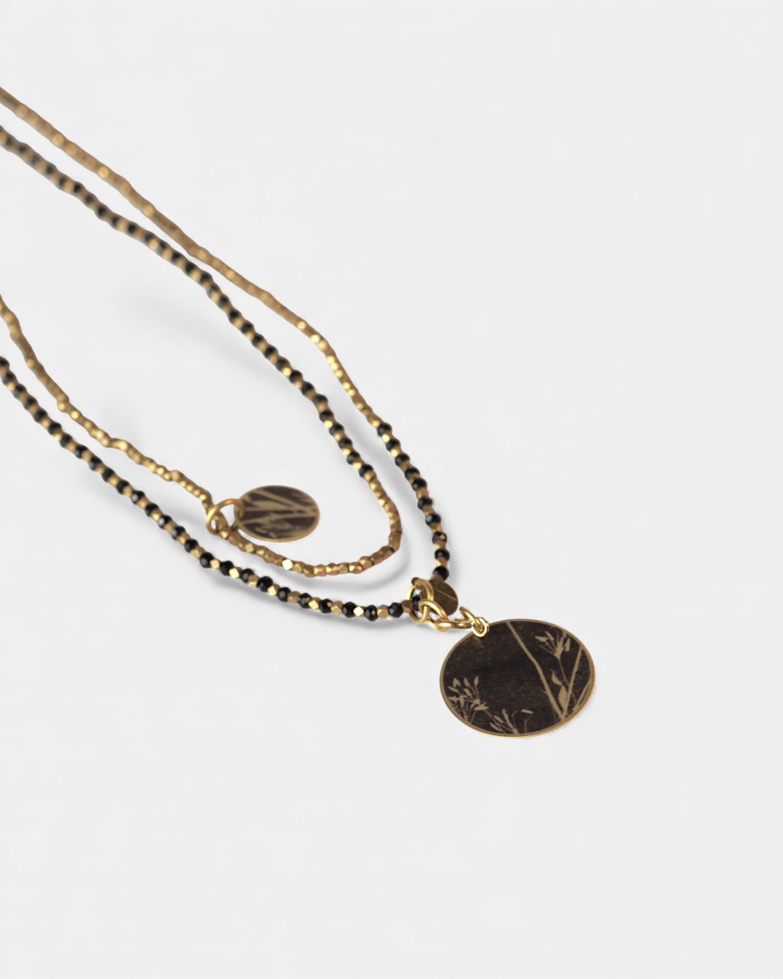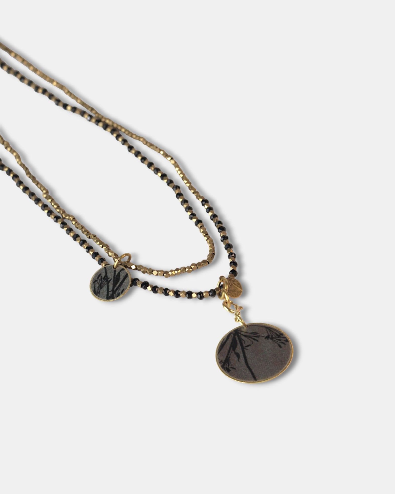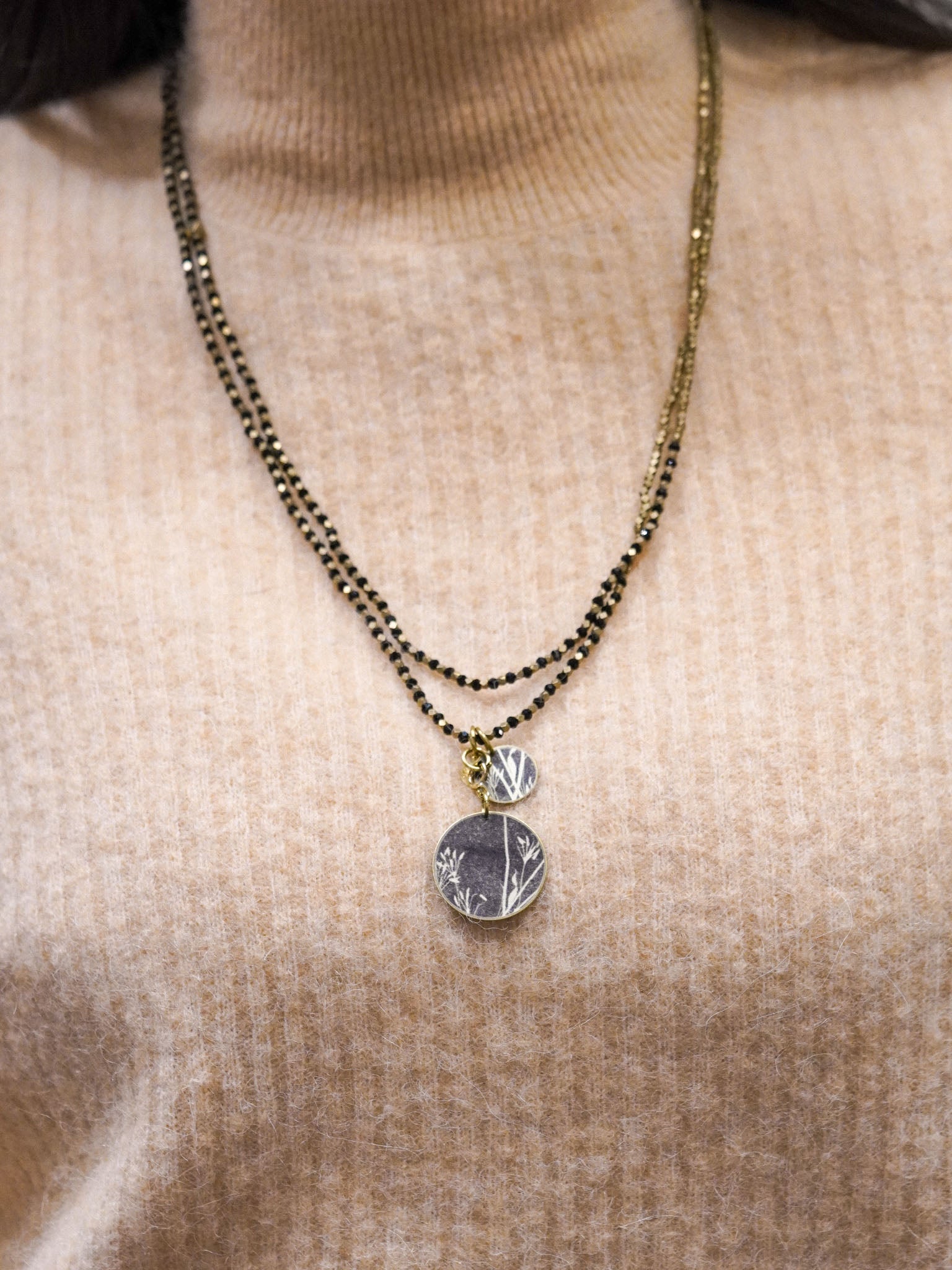 Collana lunga con perline nere e pendente reversibile tondo