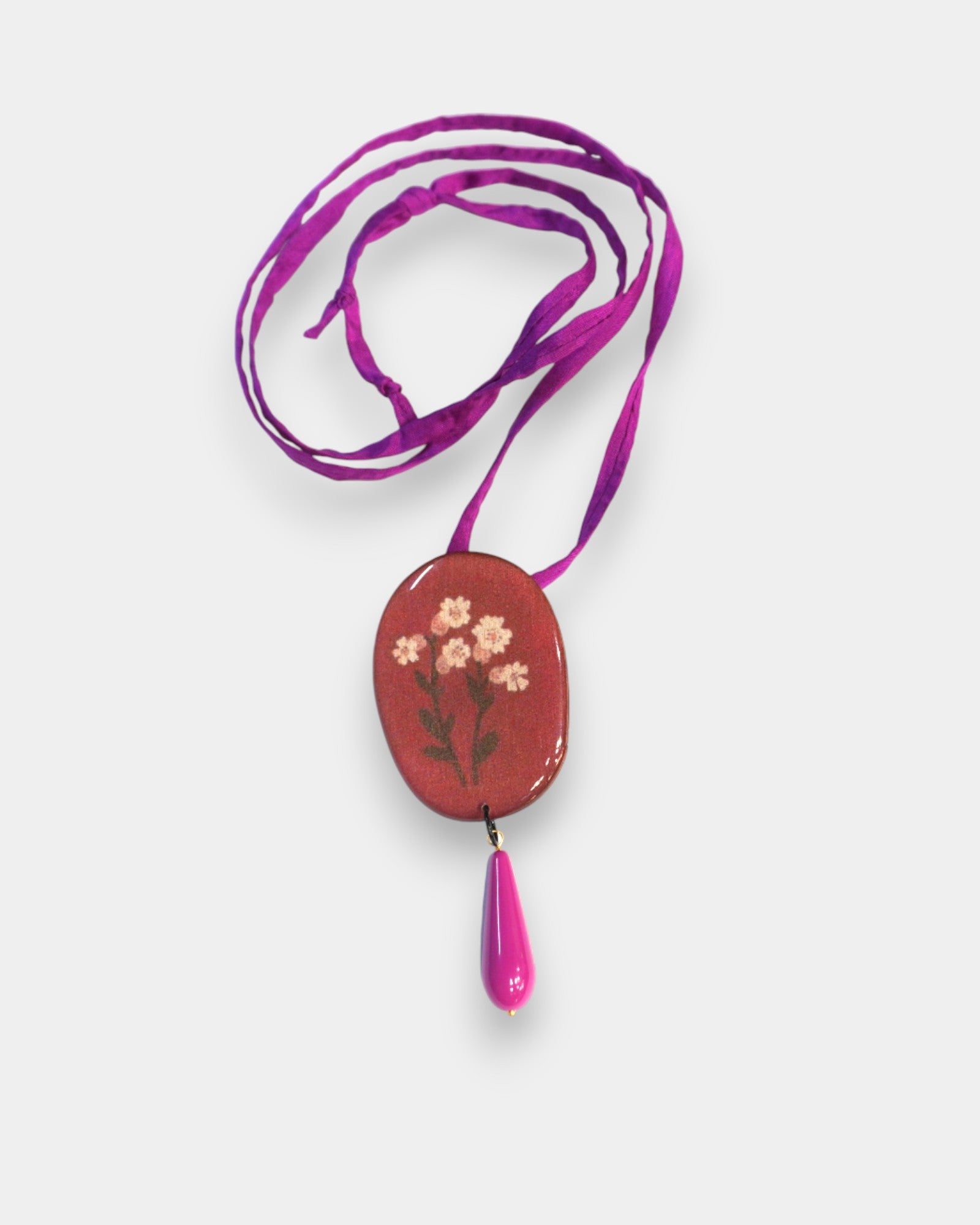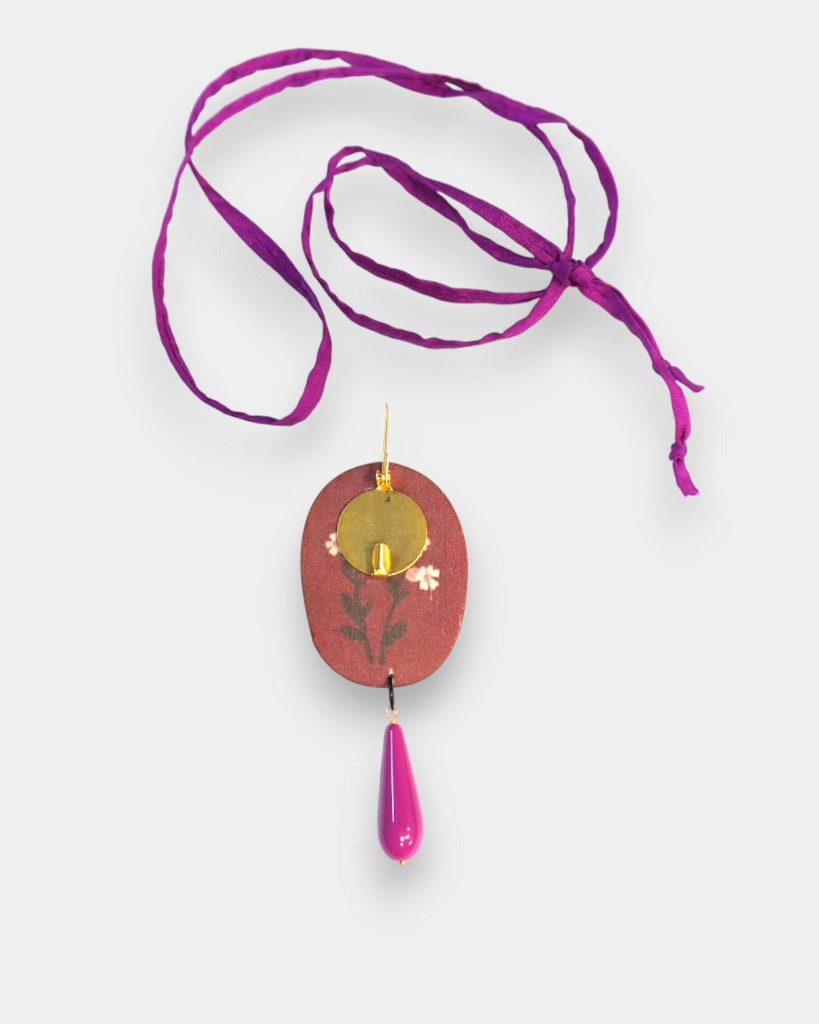 Collana con Spilla in Legno Serigrafato e Goccia Fucsia